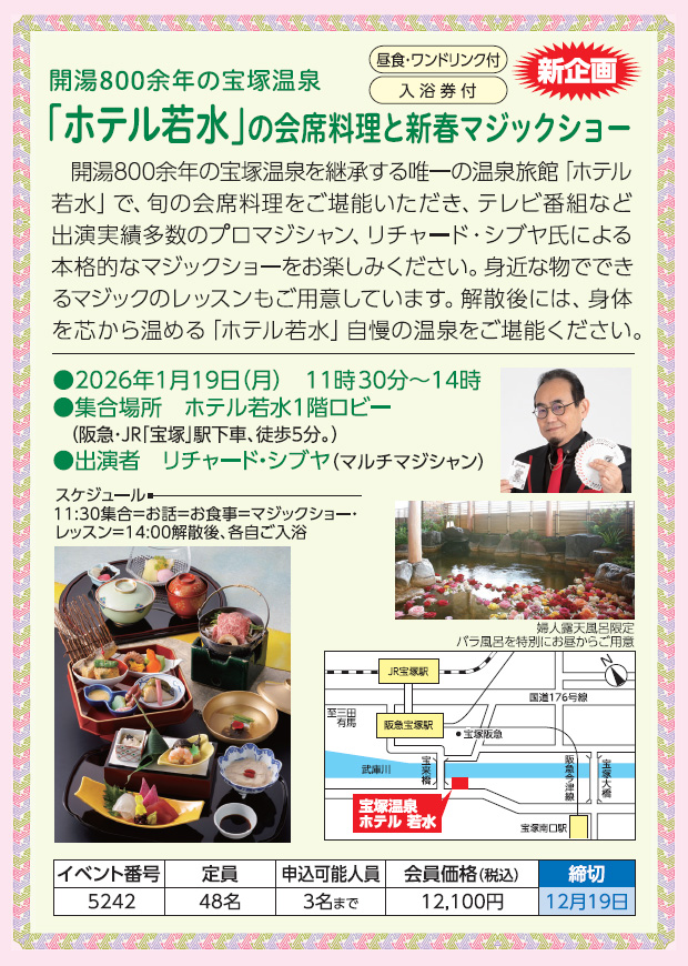 「ホテル若水」の会席料理と新春マジックショー(昼食・ワンドリンク付)(入浴券付)(新企画)