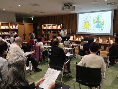 手のひらと全身の関連部位を図で確認し、どこに効いているのか意識しながらもみほぐしました。「深い深呼吸もわすれずに」とアドバイスもありました。最後に、白檀の香りのオイルを手に馴染ませながらもみほぐすと、皆さん嗅覚や触覚がゆるやかに刺激され、さらにリラックスされていました。